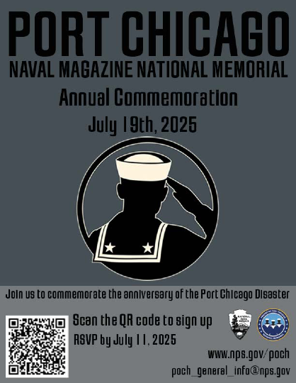 Friends of Port Chicago National Memorial, in collaboration with the National Park Service, and the U.S. Army’s 834th Transportation Battalion, invites you to join the annual Port Chicago Commemoration on July 19, 2025, at 10:00 a.m. with a reception to follow the ceremony. We will honor the 320 men who lost their lives in the largest WWII military disaster on the home front.